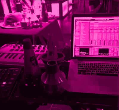 Ink is an interactive piece that uses my sound painting app (makes an abstract playing based on what you play - measuring amplitude, xyz coordinates of physical movement accelerometer/gyroscope, rhythm, and pitch), 2 channel sampling (in Max MSP), and live trumpet.